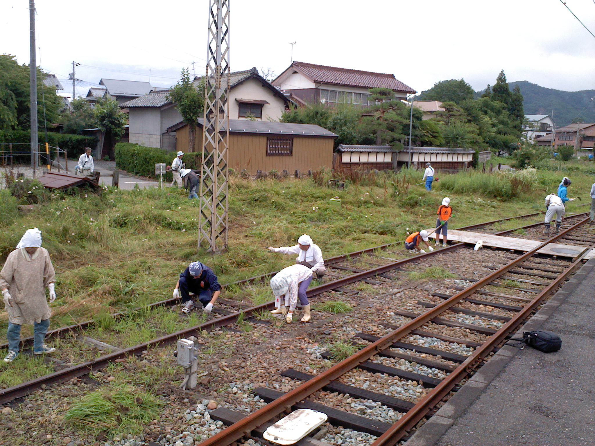 2012 年 8 月 9 日 / 最終更新日時 : 2012 年 8 月 9 日 松代町住民自治協議会 活動報告NEWS 松代駅構内の草刈りをしました! 草刈り作業の様子去る7月7日(土)松代駅構内の草刈りをしました。松代中学校野球部の1年生の皆さんをはじめ、総勢60名の方々がボランティアの呼び掛けに応えて下さいました。 おかげさまで、草に隠れていたレールが姿を現し、松代駅構内だけでなく、松代城前の踏み切り付近まできれいにすることができました。暑い中、ご参加いただいた皆様に感謝申し上げます。今後、沿線の草刈りも計画してまいりますので、皆様のご協力をよろしくお願い致します。